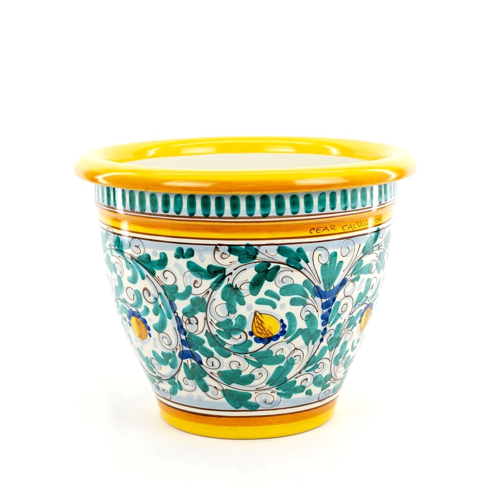 Original Majolika Keramik Blumentopf Übertopf aus Italien, Dekor grün-gelb